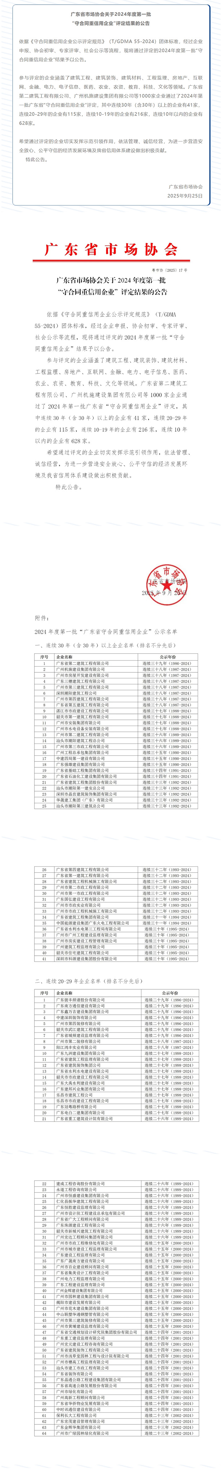 广东省市场协会关于2024年度第一批“守合同重信用企业”评定结果的公告