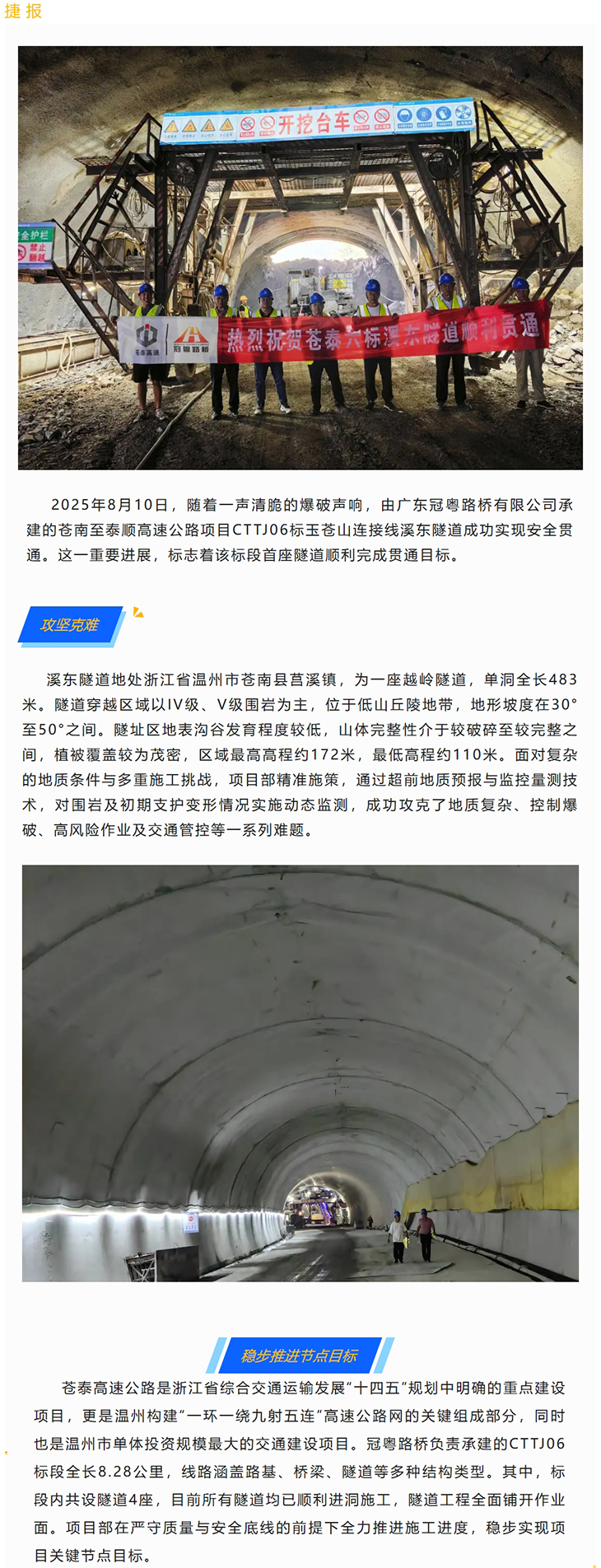 冠粤路桥承建苍泰高速六标溪东隧道顺利实现安全贯通