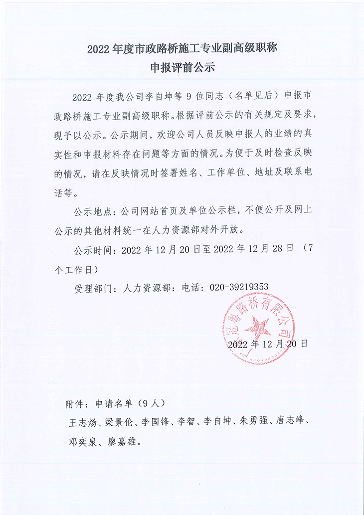 2022年度市政路桥施工专业副高级职称申报评前公示