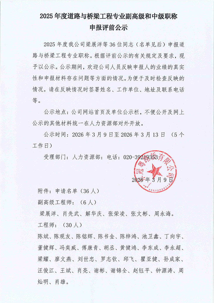 评前公示:2025年度道路与桥梁工程专业副高级职称申报评前公示