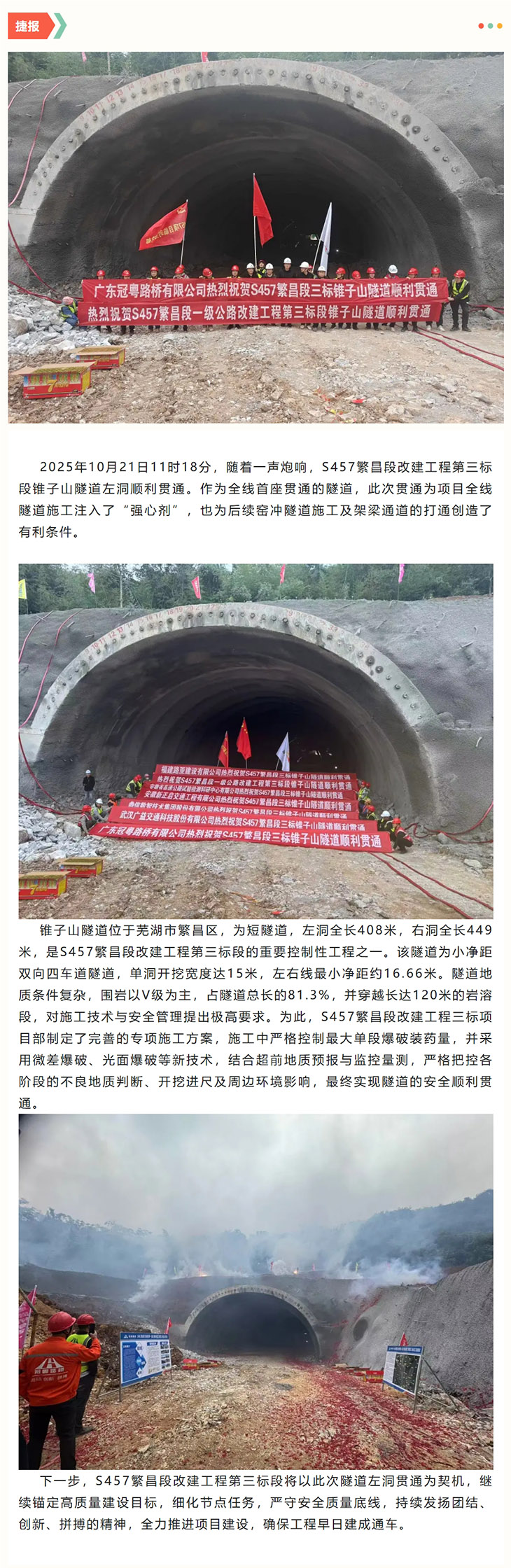 捷报!S457新港至南陵界一级公路改建工程第三标段锥子山隧道左洞顺利贯通!