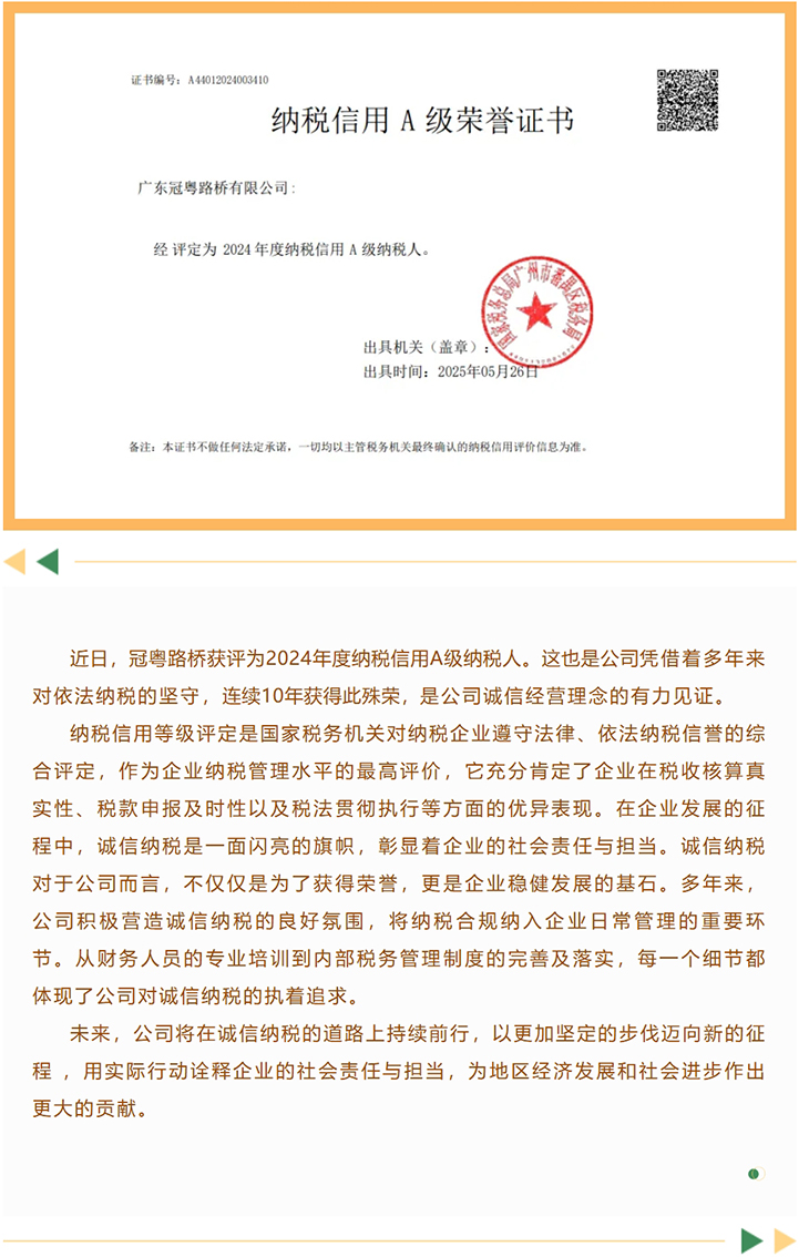 冠粤:连续10年荣获纳税信用“A级纳税人”称号,诚信铸就荣光