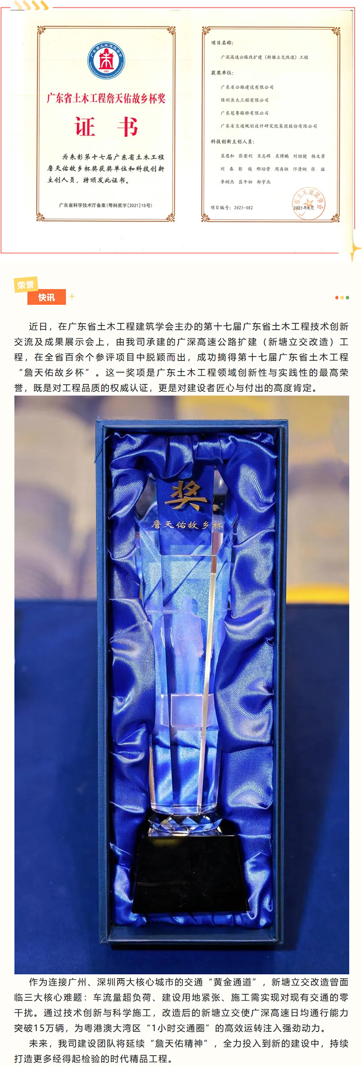 匠心筑路载誉!广深高速新塘立交改造工程斩获“詹天佑故乡杯”